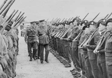 Troops are inspected by a senior official, thought to be the Governor of the Falklands Sir Allan Wolsey Cardinall