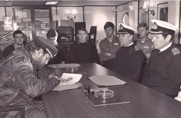 Argentine forces on South Georgia formally surrender aboard HMS "Plymouth", before "Endurance's" commanding officer, Captain Nick Barker (seated second from right) and "Plymouth's" Captain David Pentreath