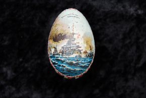 This souvenir metal egg, made in Germany, depicts ships of the German Navy which were sunk in the 1914 Battle of the Falklands