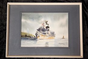 This watercolour shows SS "Uganda" at the end of her service. "Uganda" operated as a hospital ship in the islands during the 1982 war